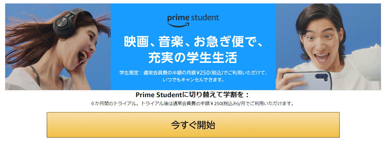 ですが、学生ならさらに! その半額の月額250円で利用することが出来るのです(Amazonさん、料金設定安過ぎませんか)。